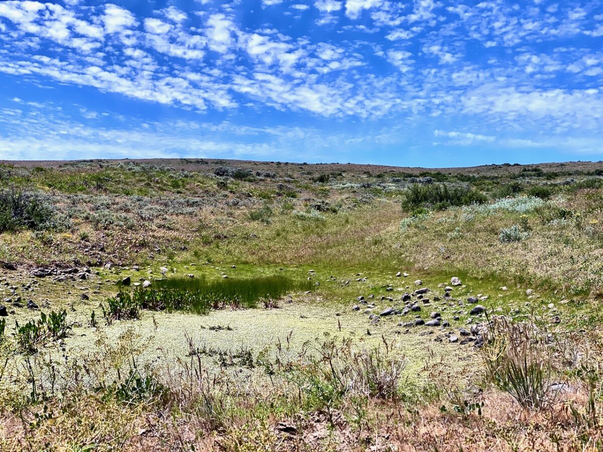 At the ridge top, I was surprised to find an area of mounds, very reminiscent of the Mima Mounds, stretching across the ridgeline for some distance. After a while, the trail approaches and follows the fence line for a distance. In one place, as the trail approached the boundary of the state lands, the map shows the trail continuing through the fence and following roadway. That fence was gated and locked, but the trail obviously continued following the fence. I came out to the roadway and found myself back on the mapped trail after a short distance.